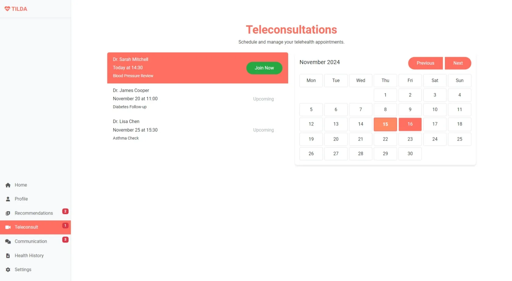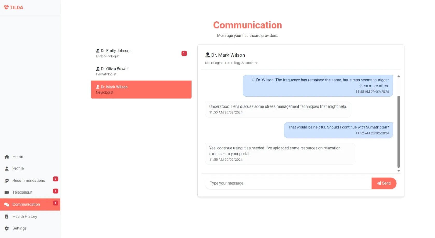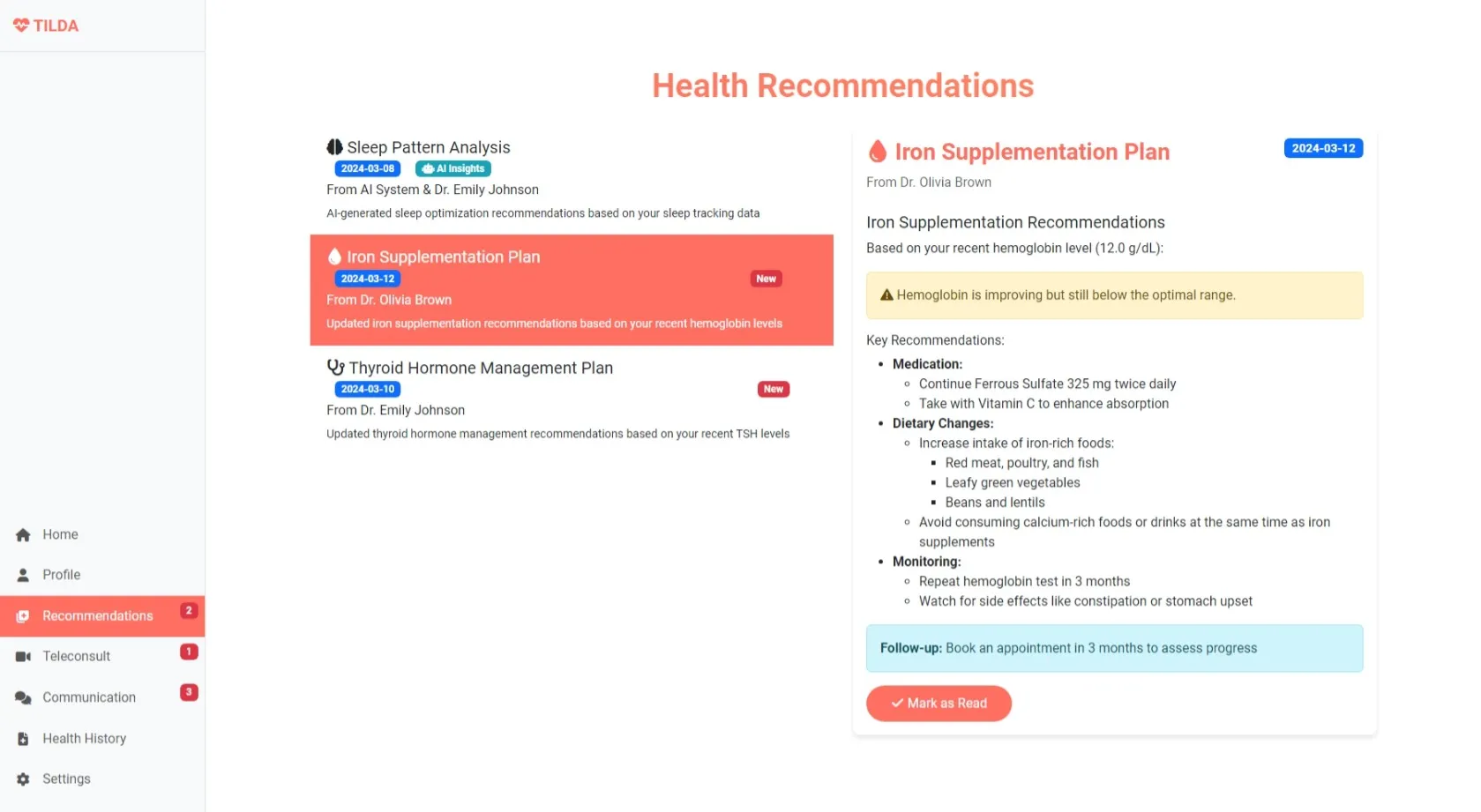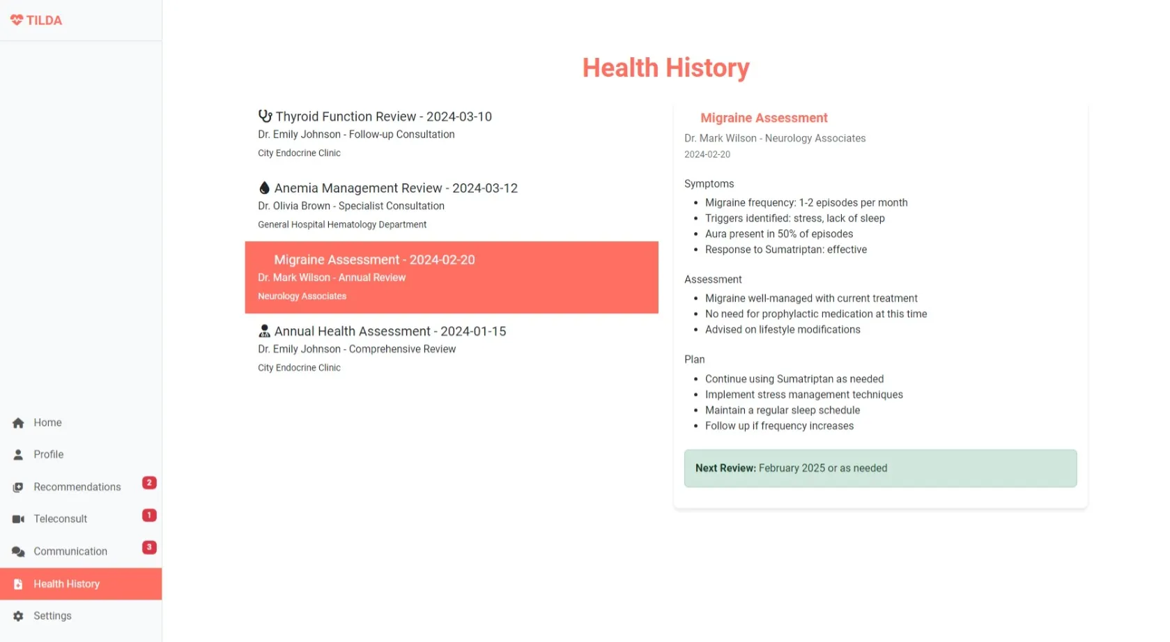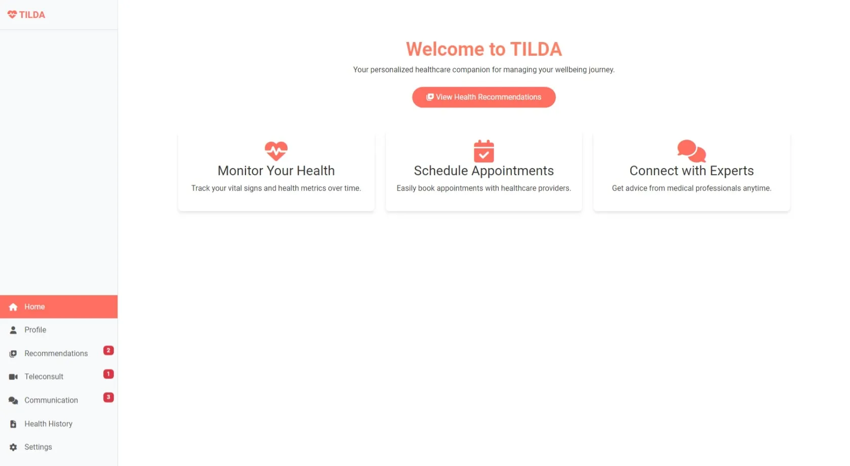 A personalised healthcare companion designed to empower you on your wellness journey. With TILDA, we believe in putting you at the heart of your healthcare, bridging the gap between complex medical data and actionable health insights.