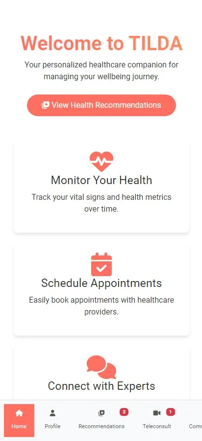 A personalised healthcare companion designed to empower you on your wellness journey. With TILDA, we believe in putting you at the heart of your healthcare, bridging the gap between complex medical data and actionable health insights.